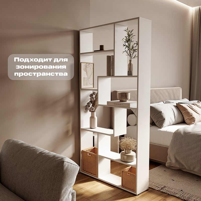 Идеально подходит для зонирования помещений — его можно использовать как элегантную перегородку, отделяющую рабочую зону от спальной или гостиной. Открытые полки предоставляют безграничные возможности для демонстрации и хранения: книг, декора, комнатных растений, коллекций, фотографий в рамках или корзин для мелочей.