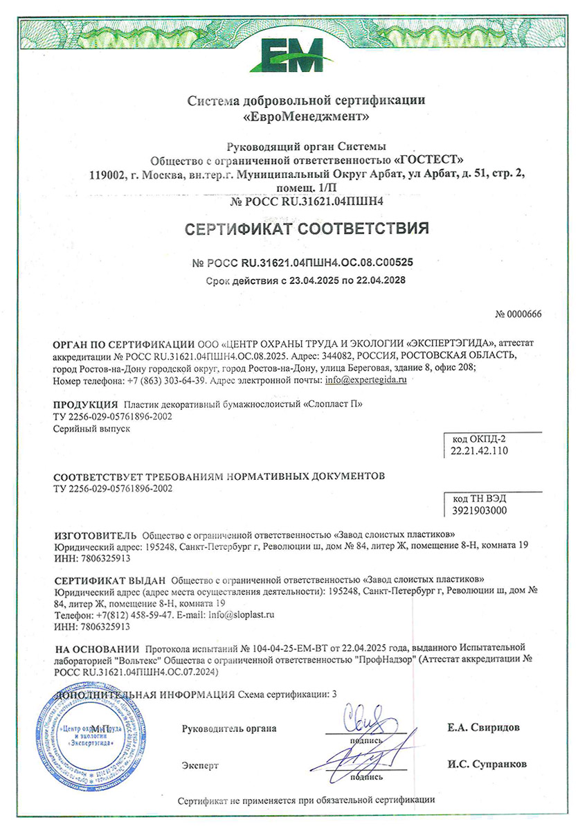 HPL Слопласт, сертификат соответствия