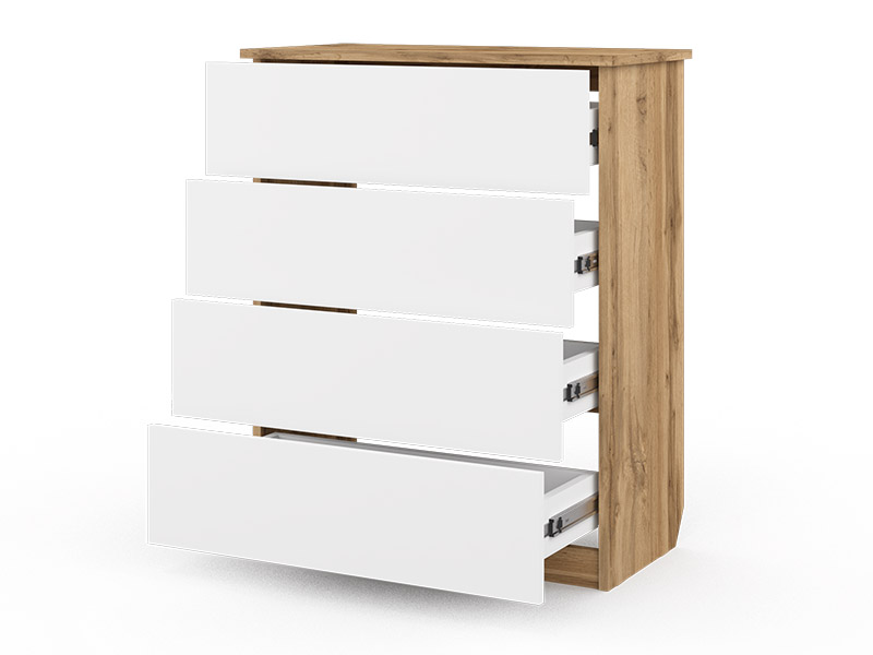Модель выполнена в классическом белом цвете, что делает её универсальной и визуально лёгкой. Четыре вместительных ящика обеспечат аккуратное хранение одежды, белья, аксессуаров или канцелярских принадлежностей. За счёт вертикальной ориентации (высота 850 мм) комод эффективно использует площадь у стены, предоставляя максимум полезного объема для хранения.