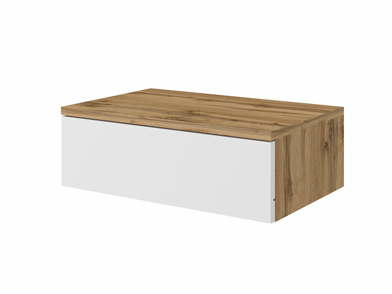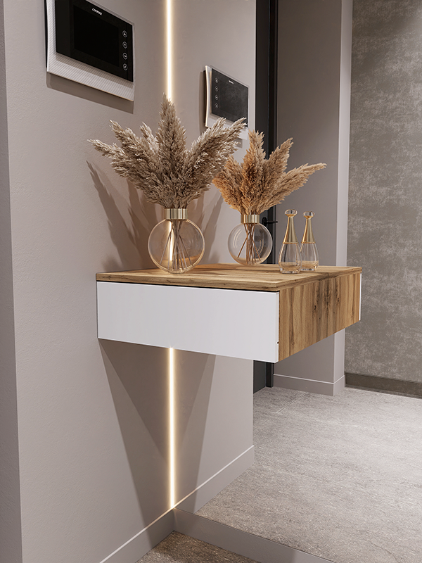 Модель выполнена в современном двухцветном дизайне — Дуб Вотан и Белый, что позволяет ей стать стильным акцентом в интерьере. Встроенный выдвижной ящик с безопасной системой открывания за нижний край защищает от случайного выпадения содержимого и удобен в использовании. Консоль крепится напрямую к стене, создавая ощущение лёгкости и не загромождая пол.