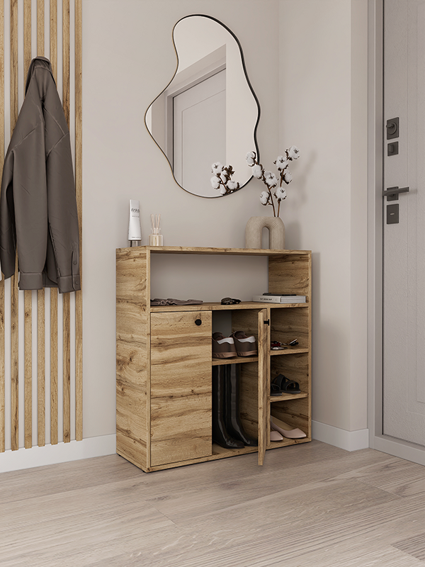 - Вместительность и универсальность: Вмещает от 6 до 10 пар обуви разного типа и размера (до 41-го). Закрытые полки подходят для аккуратного хранения, открытые — для удобного доступа к часто используемой обуви и декора.