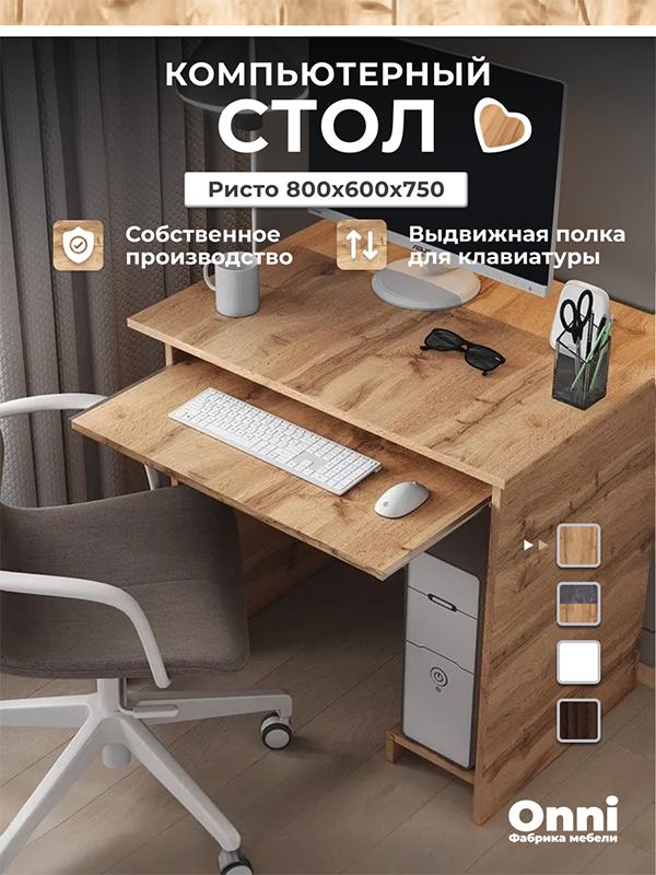 Компьютерный стол «Ристо» — это идеальное решение для организации удобного рабочего места. Благодаря продуманным габаритам он отлично подходит для небольших помещений, квартир или домашних кабинетов. Стол выполнен в современном стиле и обладает всем необходимым для комфортной работы: прочной столешницей и удобной выдвижной полкой для клавиатуры, что позволяет освободить основную поверхность и поддерживать порядок.