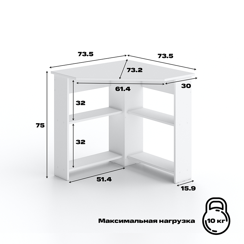 • Прочная конструкция: Изготовлен из ЛДСП толщиной 16 мм. Нагрузка на столешницу — до 25 кг (при равномерном распределении).