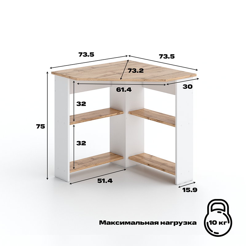 - Прочная конструкция: Изготовлен из ЛДСП толщиной 16 мм. Нагрузка на столешницу — до 25 кг (при равномерном распределении).