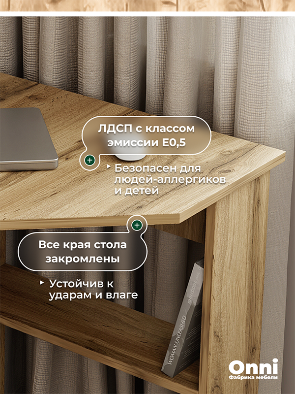 Стол изготовлен из современного безопасного материала — ЛДСП с классом эмиссии Е0,5. Это означает минимальное выделение формальдегида, что делает мебель безопасной для детских комнат, спален и для людей, склонных к аллергии.