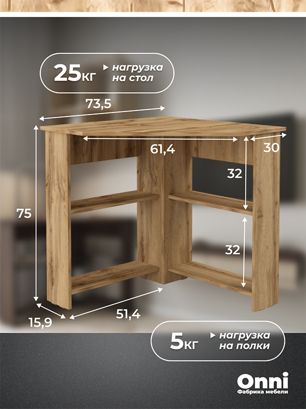- Прочная конструкция: Изготовлен из ЛДСП толщиной 16 мм. Нагрузка на столешницу — до 25 кг (при равномерном распределении).