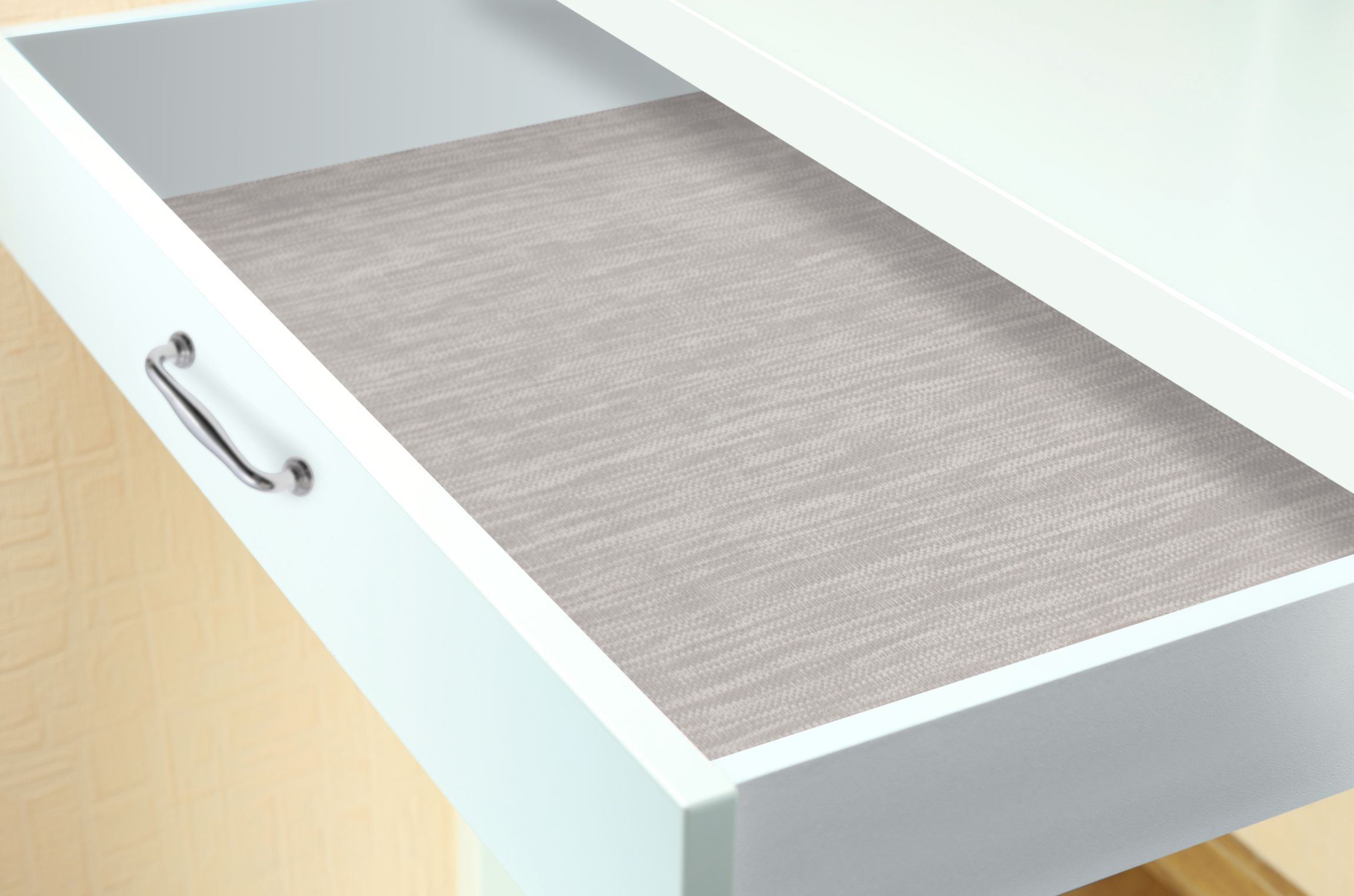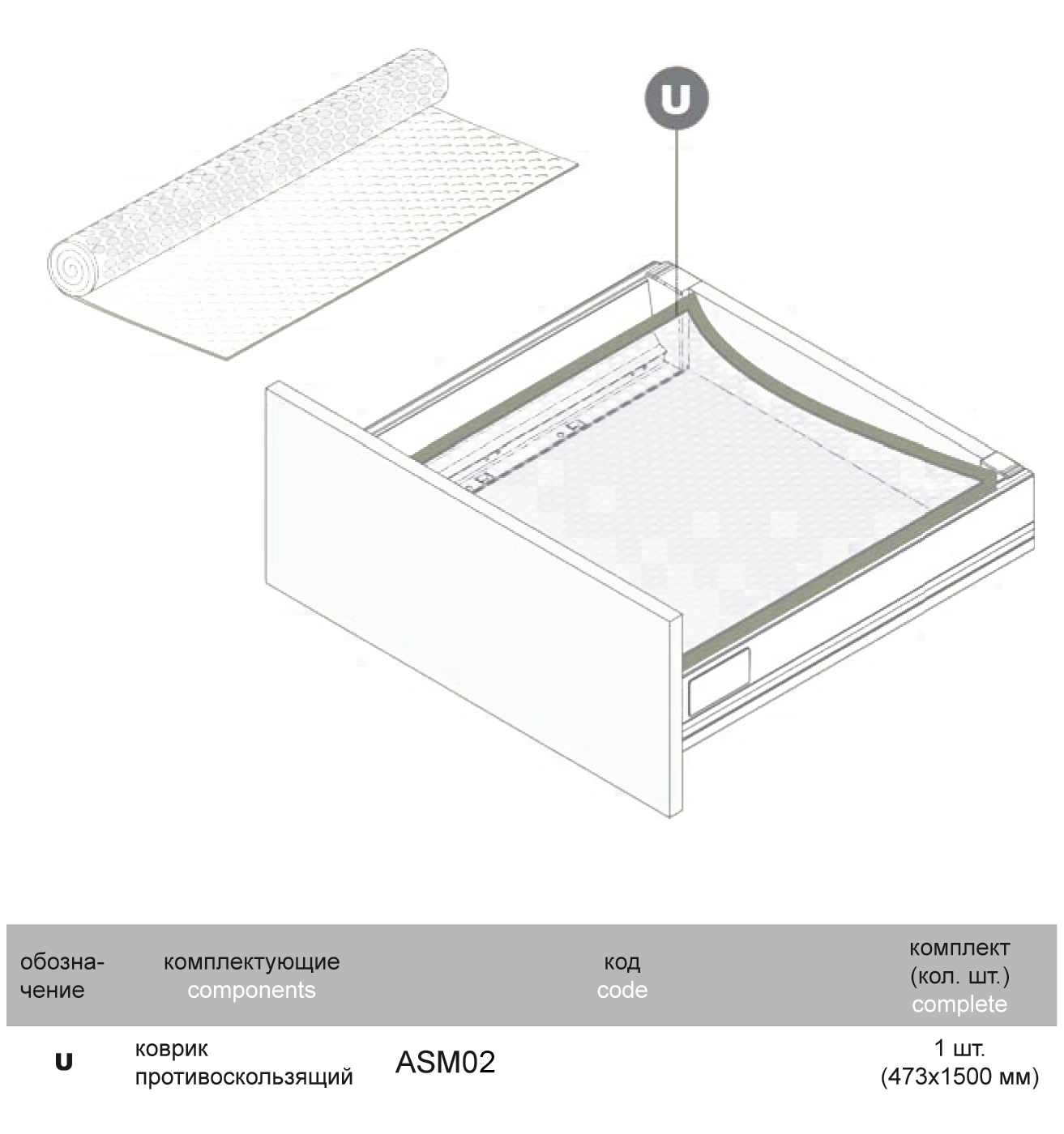 Коврик играет также декоративную роль. Выполненный в стильном сером цвете, ASM02 отлично поддержит гарнитуры в современной стилистике, темных древесных тонах. Модель обладает размерами 473*1500 мм, что позволяет вырезать коврики для ящиков различных размеров. Состав: 70% ПВХ, 30% полиэстер.