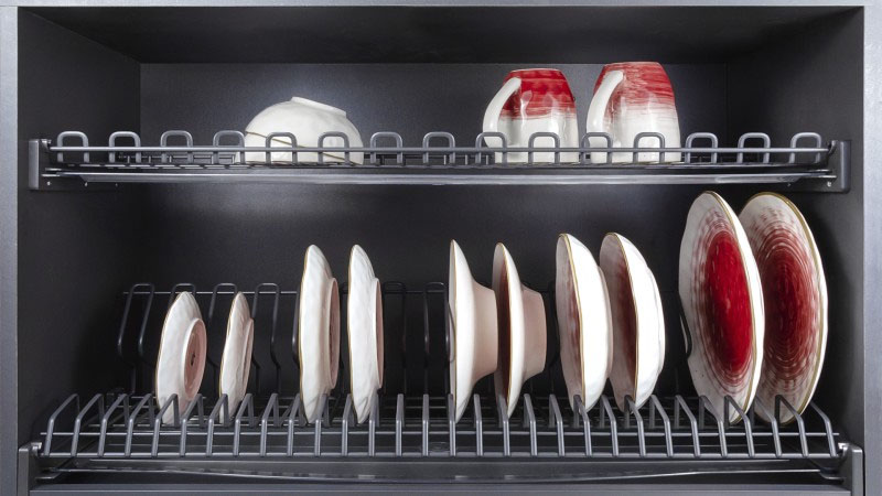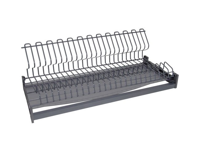 STUDIO FL 16 SU09 — сушка для посуды в верхнюю базу для мебели из плит толщиной 16 мм. Модель выполнена в современном дизайне из плоского стального прутка в нанопокрытии графитового цвета с эффектом самоочищения и водоотталкивания. Такое покрытие обеспечивает повышенную износостойкость, ударопрочность и устойчивость к коррозии. SU09 монтируется в короб без малейших зазоров.