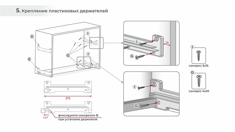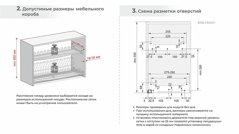 Габаритная глубина держателя верхнего уровня - всего 255 мм. Сушку можно устанавливать в компактных модулях со складным подъёмником! Регулируемый нижний держатель допускает установку в короб с внутренней глубиной от 280 мм и монтаж задней стенки 4 мм в паз.